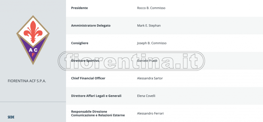 Posto che Rocco Commisso sarà il Presidente, la novità sta nel ruolo di Amministratore Delegato, che sarà ricoperto da Mark E. Stephan, uomo di fiducia di Commisso ed importante dirigente Mediacom, dove ha ricoperto diversi ruoli. Stephan ha sempre accompagnato Commisso a Firenze. Il figlio di Rocco Commisso, Joseph, sarà invece un consigliere. Nell’organigramma ufficiale, però, manca ancora la figura di Joe Barone. Possibile che si tratti di un organigramma provvisorio. Confermato il ruolo di Antognoni, ovvero quello di Club Manager.