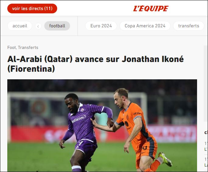 C’è sempre il Qatar come opzione per il futuro di Jonathan Ikoné. Ne è sicura L’Equipe, che dalla Francia scrive come l’esterno della Fiorentina potrebbe passare all‘Al Arabi nelle prossime settimane. Il club qatariota sta lavorando da settimane all’operazione e sarebbe ottimista sulla fumata bianca, anche se ancora manca l’accordo totale tra le parti.