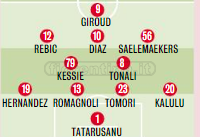 Milan: più Romagnoli di Kjaer in difesa contro la Fiorentina. Kalulu a destra per Florenzi. In mezzo Kessie