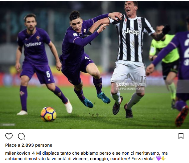 “Mi dispiace tanto che abbiamo perso e non meritavamo, ma abbiamo dimostrato la volontà di vincere, coraggio, carattere! Forza viola”. Questo il messaggio inerente alla partita con la Juventus che il giovane Nikola Milenkovic, autore di un’ottima prestazione ieri sera, ha affidato al proprio profilo Instagram.
