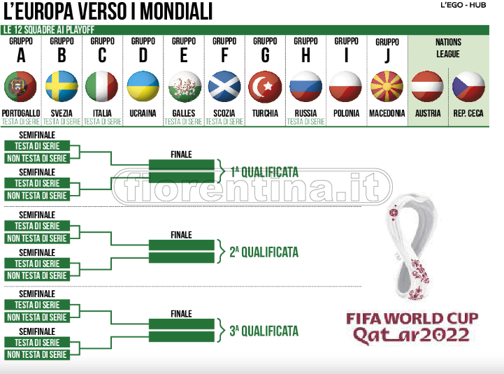Mondiali: oggi alle 17 il sorteggio per gli spareggi che permetteranno ad altre 3 Nazionali d’Europa di qualificarsi a Qatar 2022. I possibili avversari per l’Italia