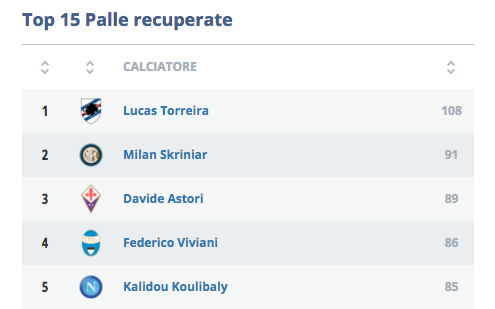 Partiamo dai palloni recuperati. Dato che balza all’occhio, perché il capitano Davide Astori è sul podio di questa speciale classifica. Davanti a lui Torreira della Samp a quota 108 e Skriniar dell’Inter che si è fermato a 91. Terzo, appunto, Astori, a quota 89.