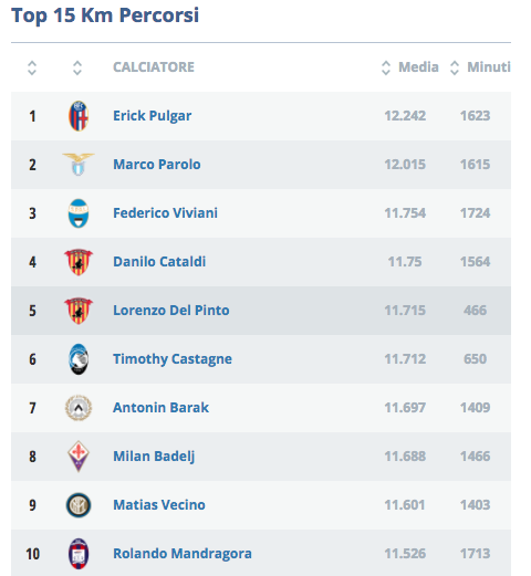 Andando avanti, scopriamo anche la classifica dei ‘maratoneti’ del campionato. Il giocatore che corre di più in casa Fiorentina, nella Top 10 della Serie A, è Milan Badelj. Sul podio Pulgar del Bologna, Parolo e Federico Viviani della Spal.