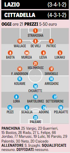 Pochi i cambi in vista per Inzaghi contro il Cittadella stasera nell’ottavo di Coppa Italia che decreterà l’avversario della Fiorentina ai quarti. In porta Strakosha, dietro De Vrij e Patric, in mezzo Basta, Murgia, Leiva e Lukaku. Milinkovic sarà a supporto di Felipe Anderson e Immobile. Panchina, dunque, per Parolo mentre è out Luis Alberto.