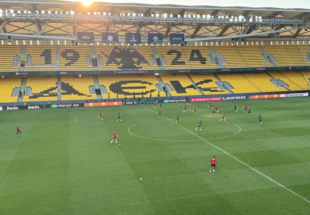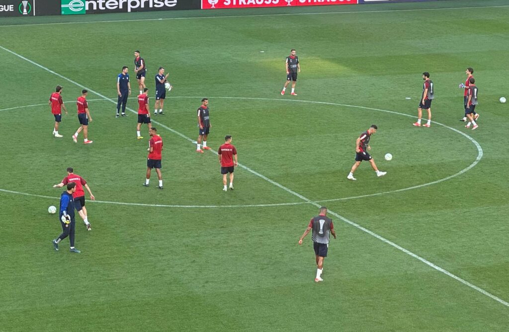 Squadra greca in campo in questi minuti in vista della Finale di domani che, ad Atene, vedrà Olympiacos e Fiorentina giocarsi la vittoria della Conference League: