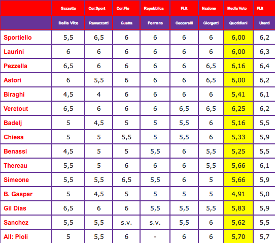 Fiorentina sconfitta in trasferta dalla Juventus per 1-0 con un gol di Mandzukic. Queste le pagelle dei quotidiani sportivi e di LaViola.it, a confronto con le valutazioni che voi utenti avete dato votando le Pagelle dei Tifosi.