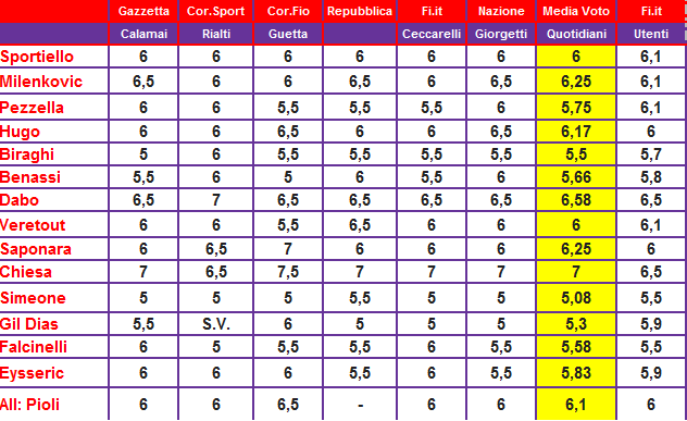 Dopo il pareggio rimediato contro la Spal per 0-0 al Franchi, questi i giudizi a confronto della stampa nazionale e fiorentina e degli utenti di LaViola.it…