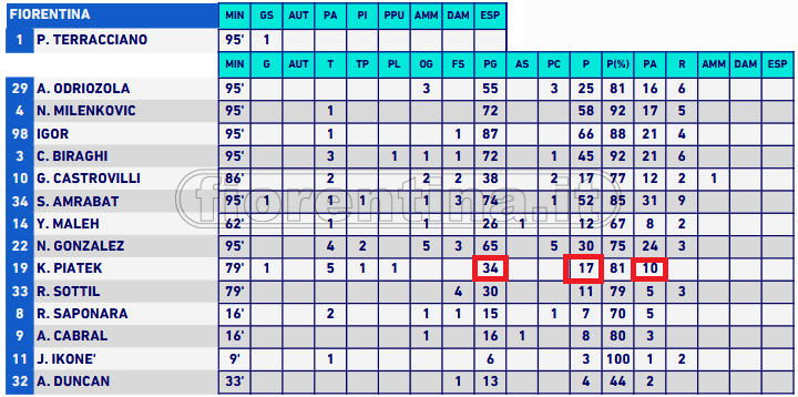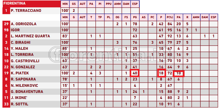 REGISTA D’ATTACCO. In mezzo ai tanti elogi proferiti dal tecnico viola per il polacco, per atteggiamento e carica in allenamento ma anche per rendimento sul campo, vista la doppietta realizzata a Bergamo, anche la sottolineatura su cosa e dove si aspettasse una crescita da parte del pistolero. Nelle dinamiche di gioco d’attacco di questa Fiorentina, d’altronde, Vlahovic non era solamente il terminale offensivo, ma una sorta di regista d’attacco. Dal serbo, infatti, passavano quasi tutti i palloni di bassa o media altezza in fase di ripartenza di Biraghi (non a caso tra i calciatori con il maggior numero di passaggi chiave in questa Serie A), così come quelli alti di Terracciano, assieme a quelli in profondità. La sponda del nove che si abbassa per venire incontro al pallone mettendo in moto l’esterno offensivo di turno o la mezz’ala d’inserimento, sono un must del credo tattico di Italiano. La crescita di Piatek su tale aspetto, oltre che ad occhio nudo, la si nota anche nei numeri.
