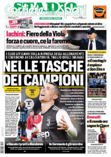 Queste le prime pagine dei quotidiani di Corriere dello Sport, Corriere dello Sport Stadio, Qs-La Nazione, Tuttosport e Gazzetta dello Sport in edicola questa mattina: