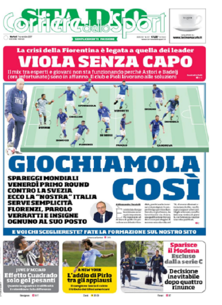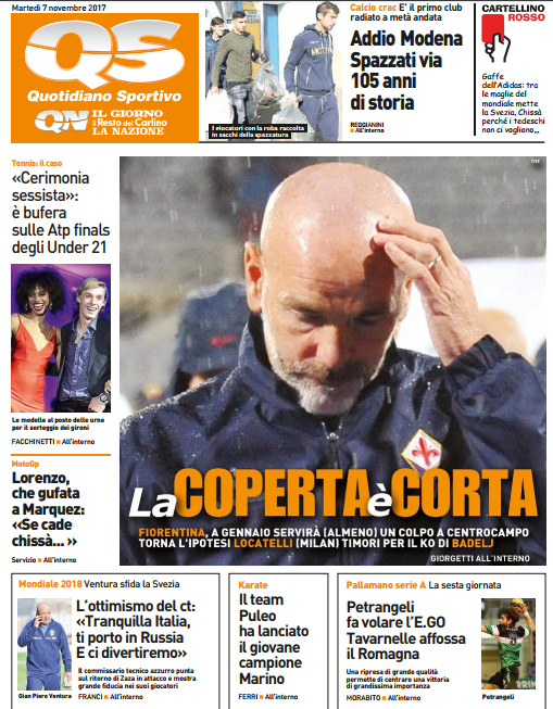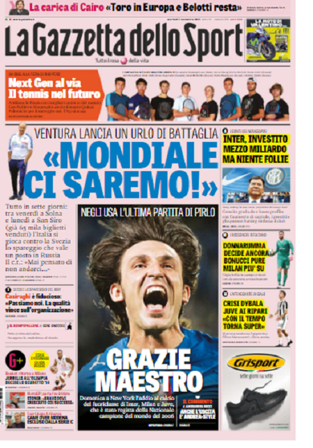 Queste le prime pagine dei quotidiani di Corriere dello Sport, Corriere dello Sport Stadio, Qs-La Nazione, Tuttosport e Gazzetta dello Sport in edicola questa mattina: