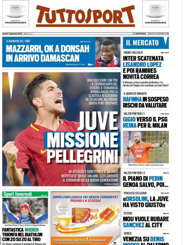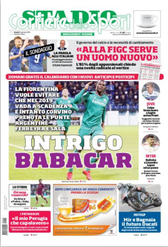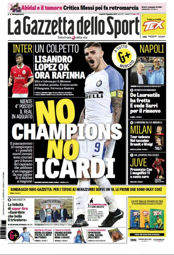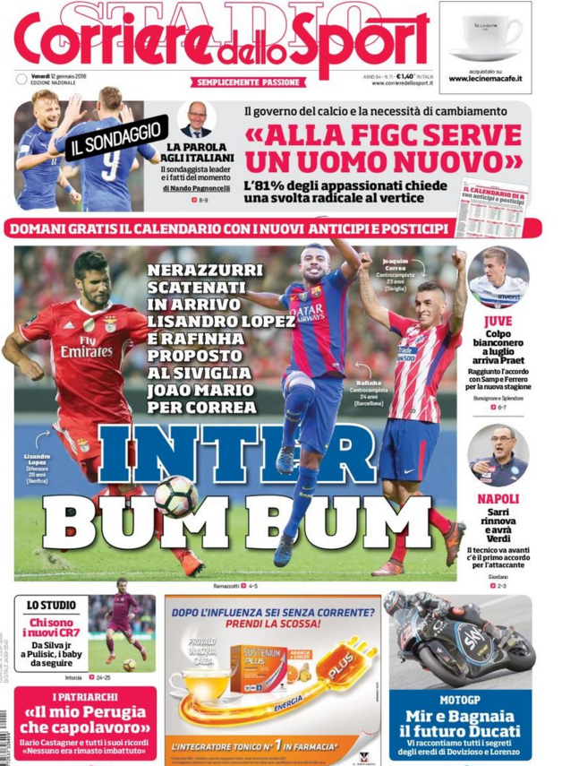 Queste le prime pagine dei quotidiani di Corriere dello Sport, Corriere dello Sport Stadio, Qs-La Nazione, Tuttosport e Gazzetta dello Sport in edicola: