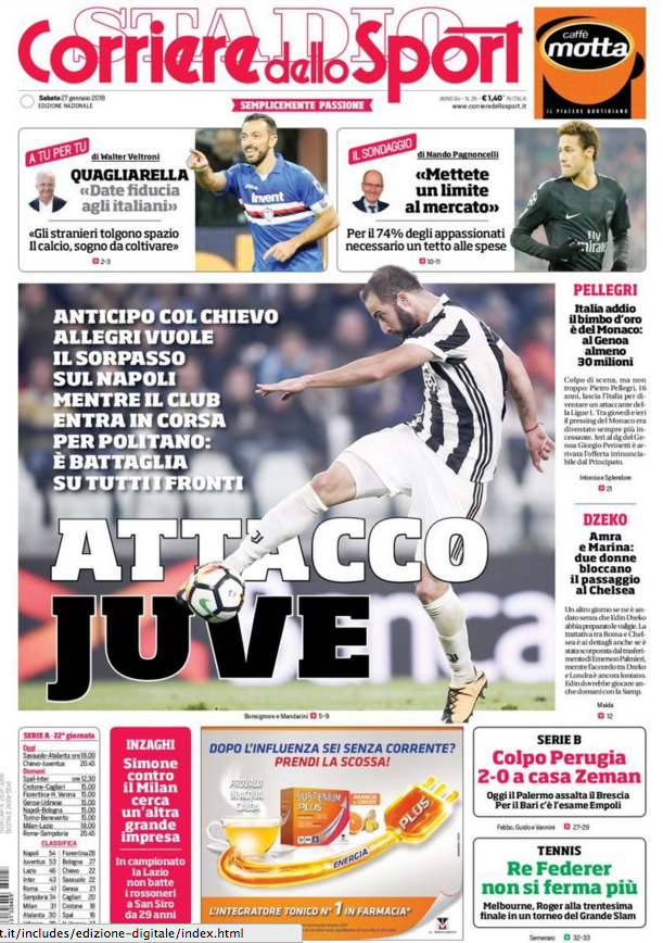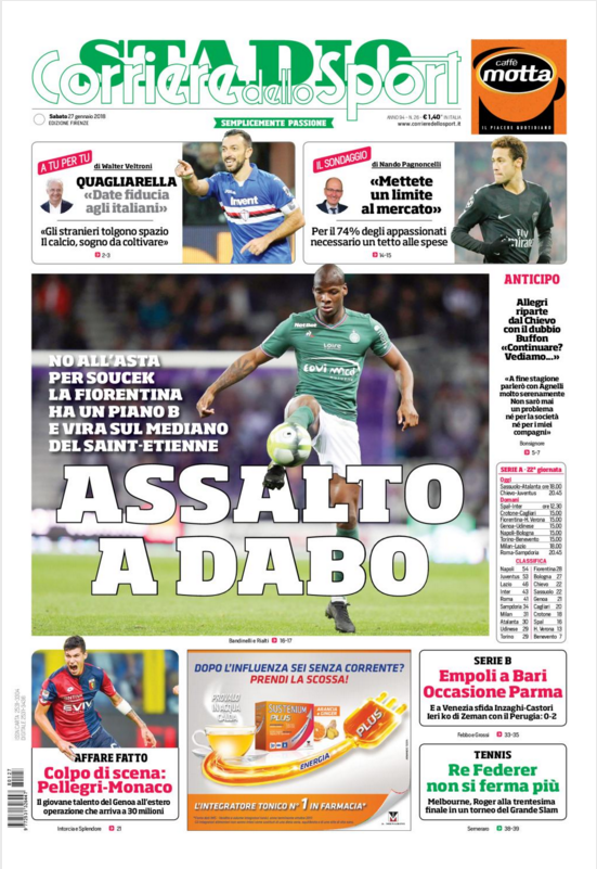 Queste le prime pagine dei quotidiani di Corriere dello Sport, Corriere dello Sport Stadio, Qs-La Nazione, Tuttosport e Gazzetta dello Sport in edicola: