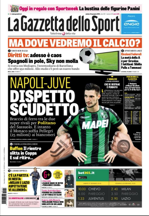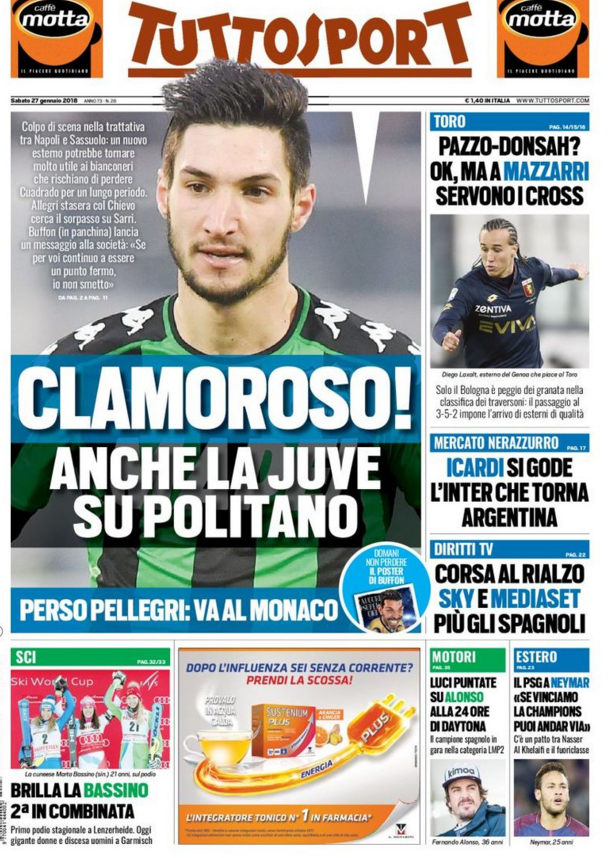 Quotidiani: la prima pagina di Qs, Stadio, Gazzetta, Corriere dello Sport, Tuttosport