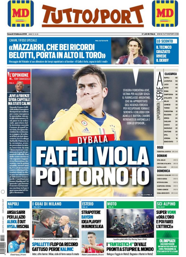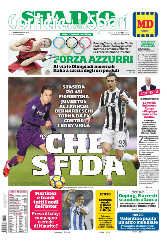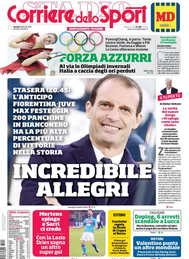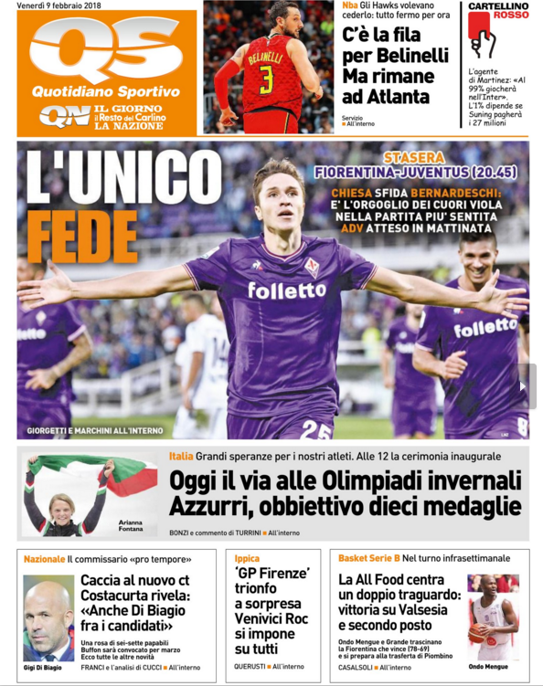 Queste le prime pagine dei quotidiani di Corriere dello Sport, Corriere dello Sport Stadio, Qs-La Nazione, Tuttosport e Gazzetta dello Sport in edicola:
