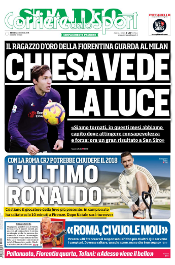 Queste le prime pagine dei quotidiani di Corriere dello Sport, Corriere dello Sport Stadio, Qs-La Nazione, Tuttosport e Gazzetta dello Sport in edicola questa mattina: