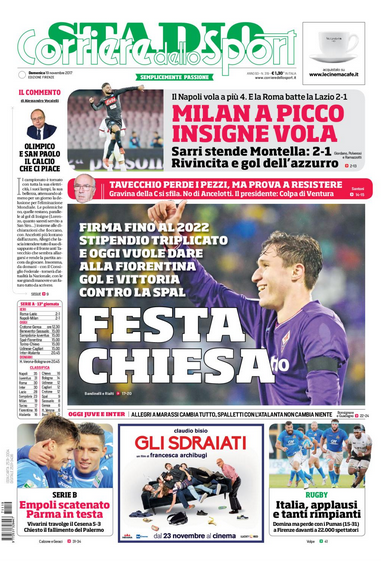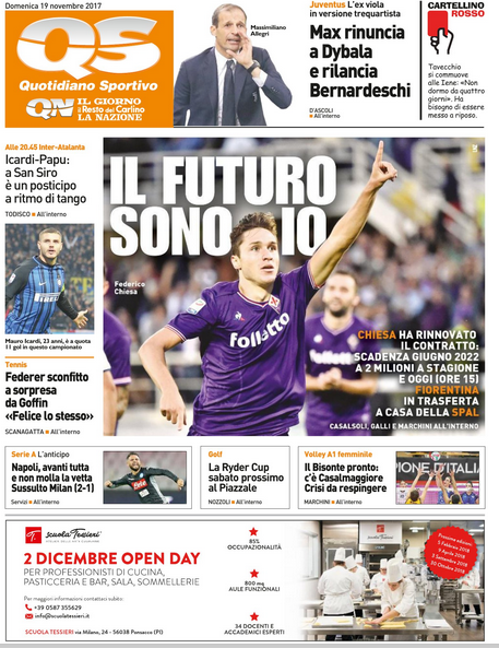 Queste le prime pagine dei quotidiani di Corriere dello Sport, Corriere dello Sport Stadio, Qs-La Nazione, Tuttosport e Gazzetta dello Sport in edicola questa mattina: