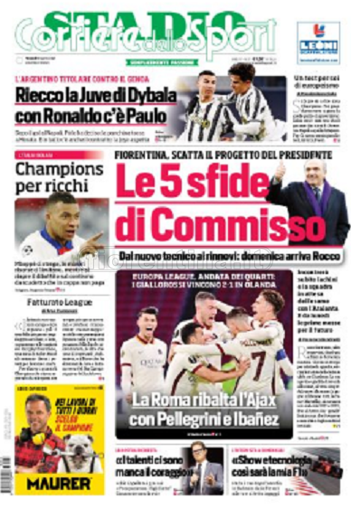 Queste le prime pagine dei quotidiani di Corriere dello Sport, Corriere dello Sport Stadio, Qs-La Nazione, Tuttosport e Gazzetta dello Sport in edicola questa mattina: