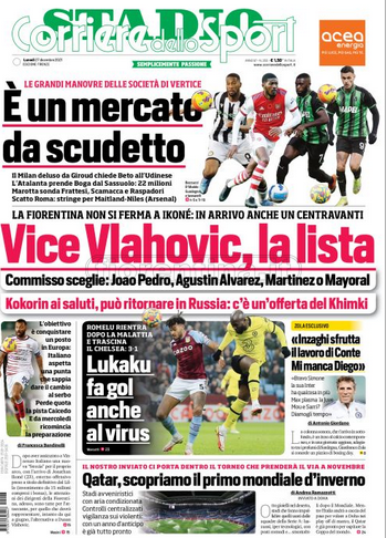 Queste le prime pagine dei quotidiani di Corriere dello Sport, Corriere dello Sport Stadio, Qs-La Nazione, Tuttosport e Gazzetta dello Sport in edicola questa mattina:
