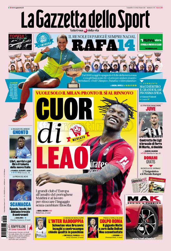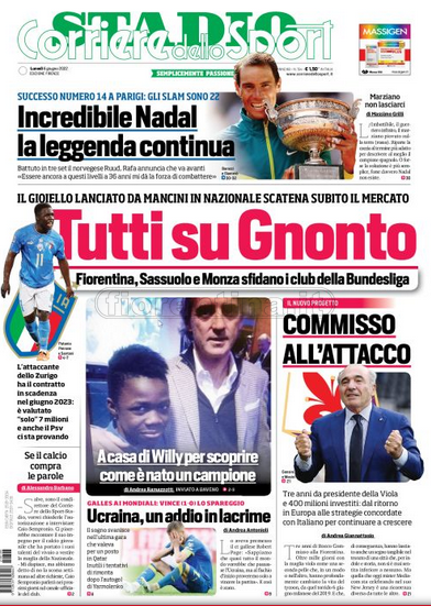 Queste le prime pagine dei quotidiani di Corriere dello Sport, Corriere dello Sport Stadio, Qs-La Nazione, Tuttosport e Gazzetta dello Sport in edicola questa mattina: