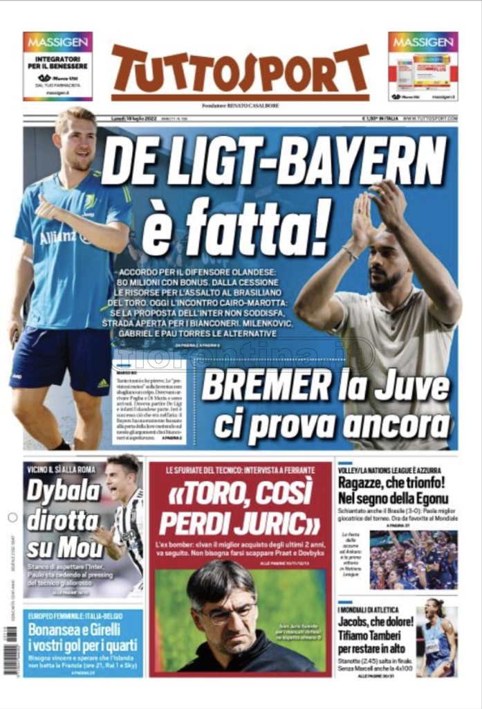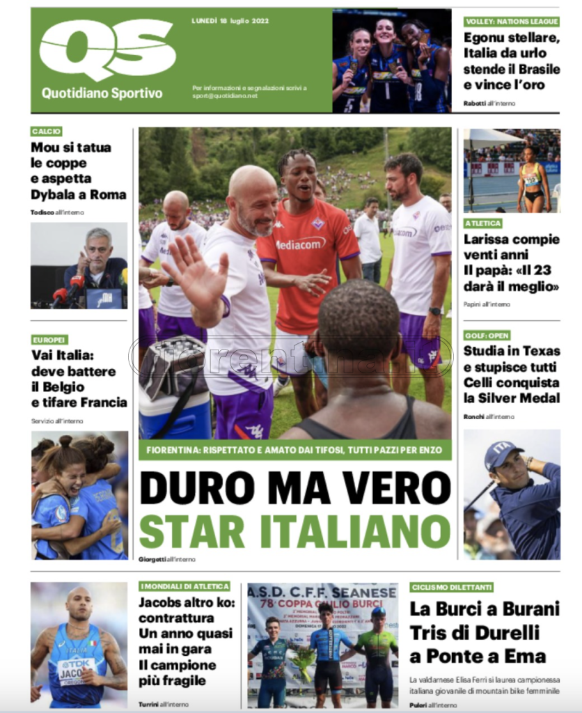 Queste le prime pagine dei quotidiani di Corriere dello Sport, Corriere dello Sport Stadio, QS-La Nazione, Tuttosport e Gazzetta dello Sport in edicola questa mattina
