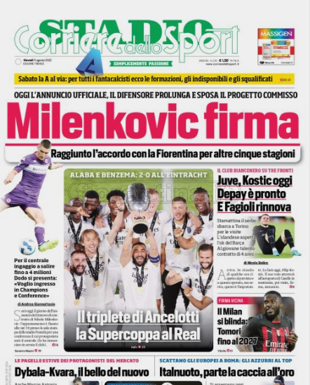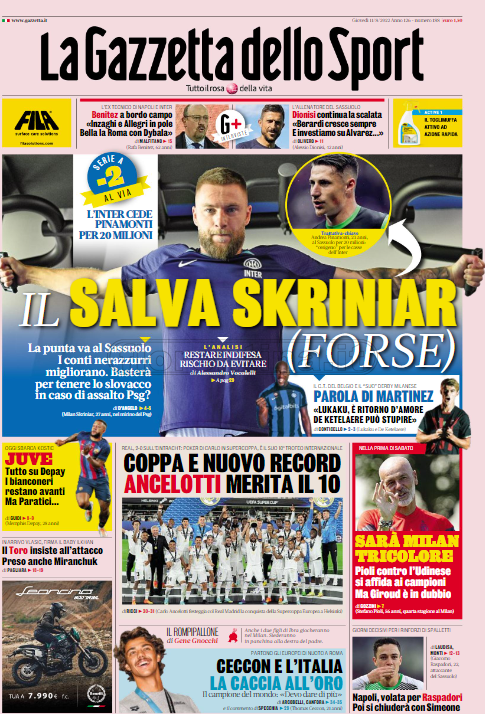 Queste le prime pagine dei quotidiani di Corriere dello Sport, Corriere dello Sport Stadio, Qs-La Nazione, Tuttosport e Gazzetta dello Sport in edicola questa mattina: