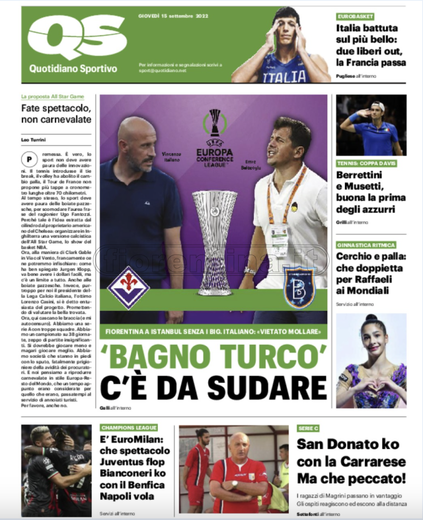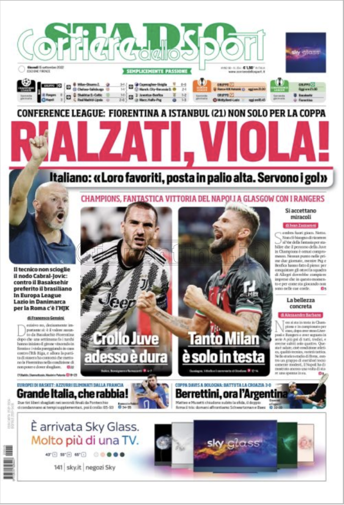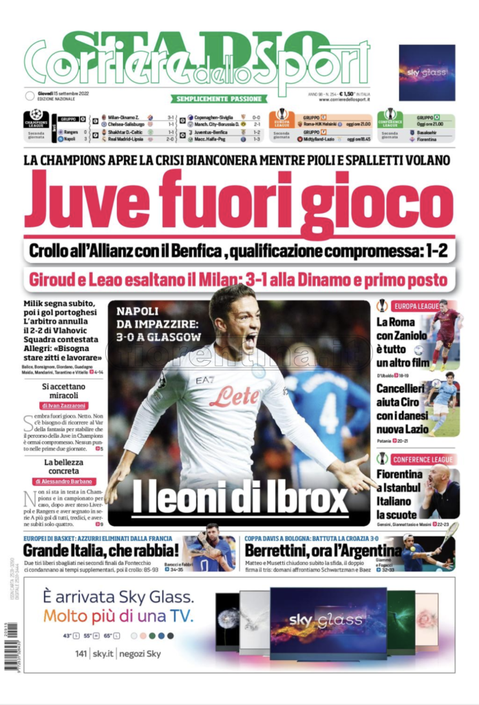 Queste le prime pagine dei quotidiani di Corriere dello Sport, Corriere dello Sport Stadio, QS-La Nazione, Tuttosport e Gazzetta dello Sport in edicola questa mattina