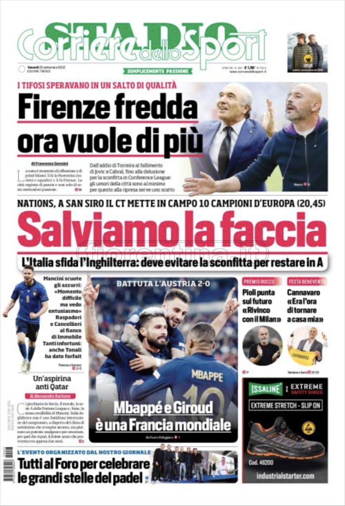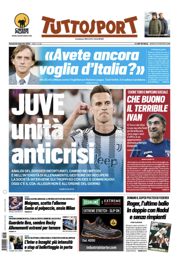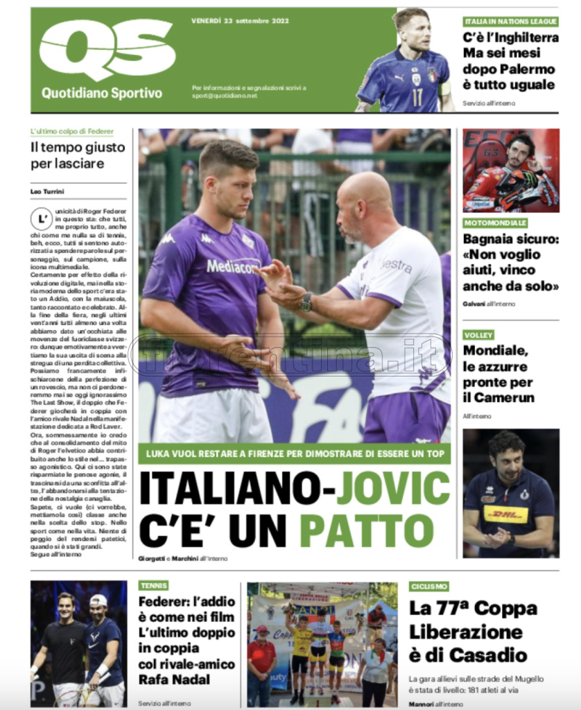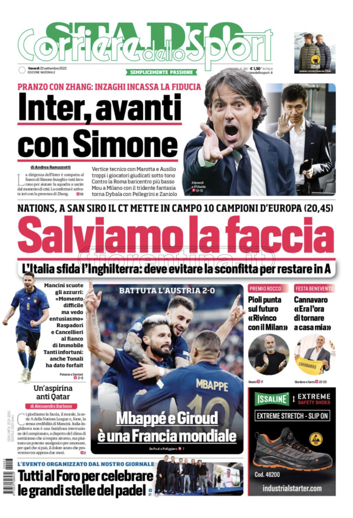 Queste le prime pagine dei quotidiani di Corriere dello Sport, Corriere dello Sport Stadio, Qs-La Nazione, Tuttosport e Gazzetta dello Sport in edicola questa mattina
