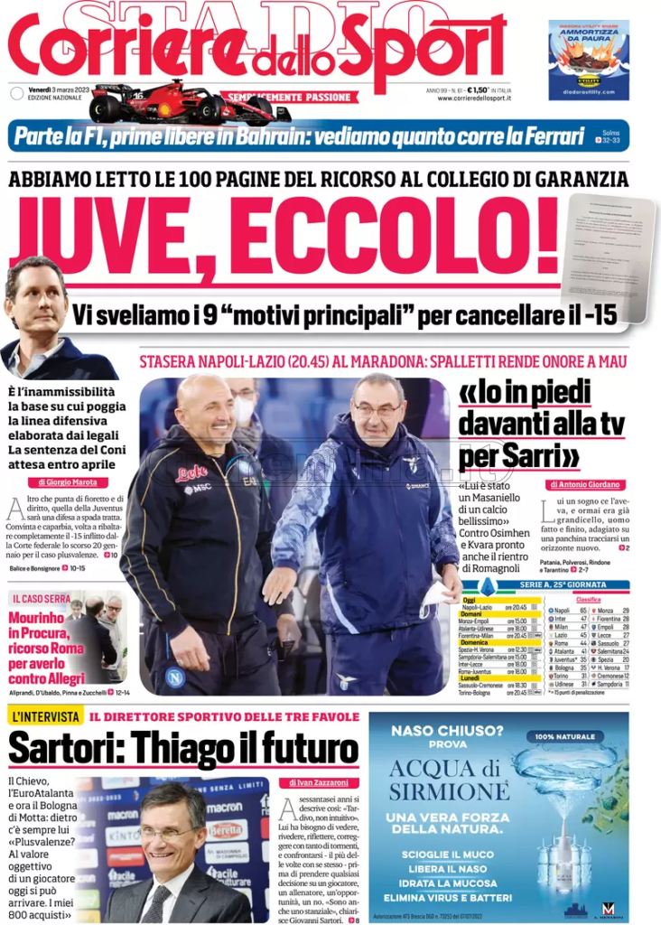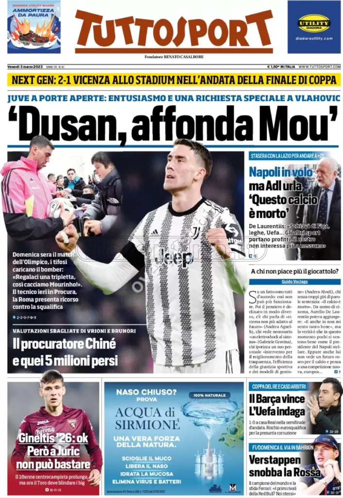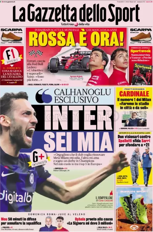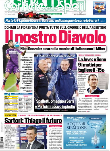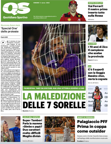 Queste le prime pagine dei quotidiani di Corriere dello Sport, Corriere dello Sport Stadio, Qs-La Nazione, Tuttosport e Gazzetta dello Sport in edicola questa mattina: