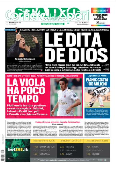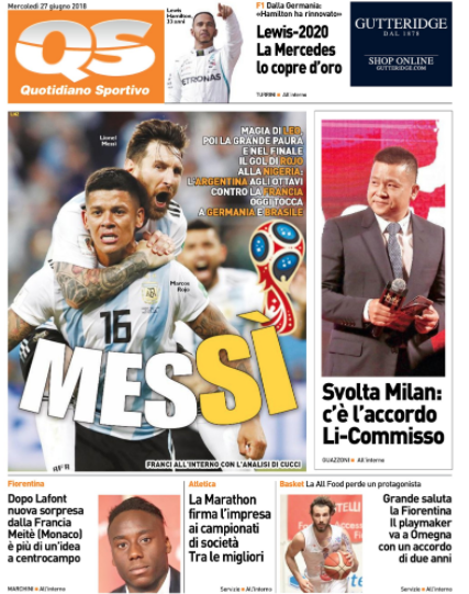 Queste le prime pagine dei quotidiani di Corriere dello Sport, Corriere dello Sport Stadio, Qs-La Nazione, Tuttosport e Gazzetta dello Sport in edicola questa mattina: