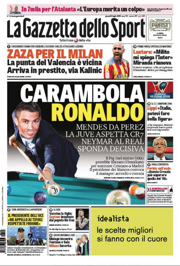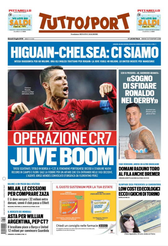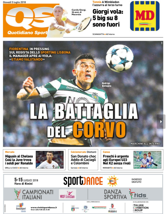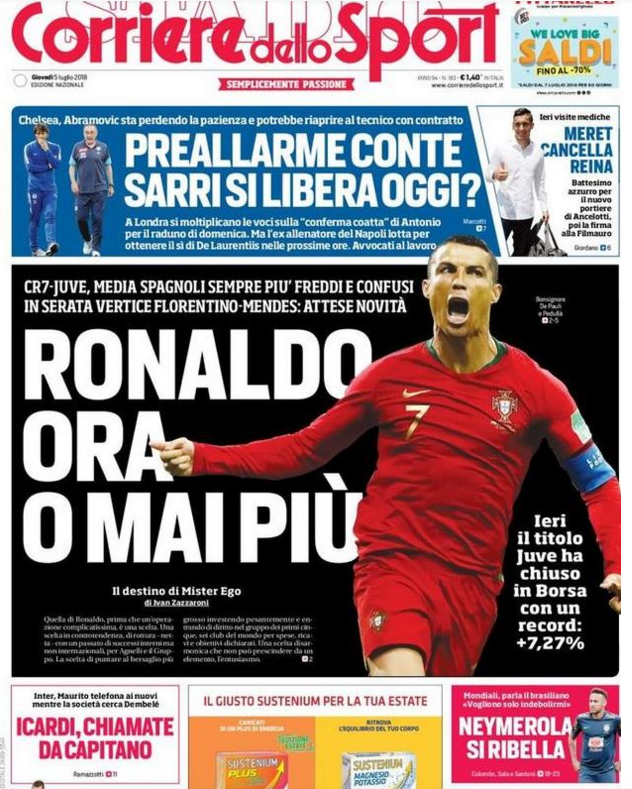 Queste le prime pagine dei quotidiani di Corriere dello Sport, Corriere dello Sport Stadio, Qs-La Nazione, Tuttosport e Gazzetta dello Sport in edicola questa mattina:
