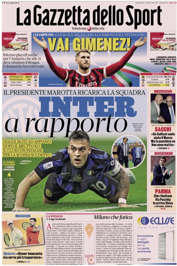 Queste le prime pagine dei quotidiani di Corriere dello Sport, Qs-La Nazione, Tuttosport e Gazzetta dello Sport in edicola questa mattina