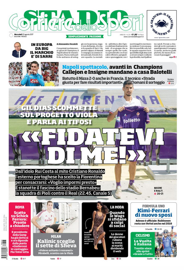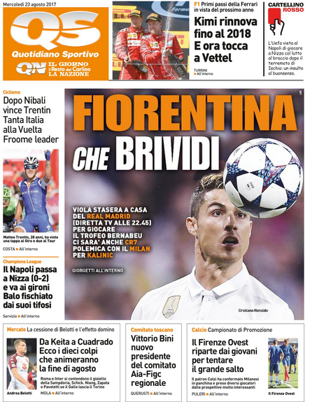Queste le prime pagine dei quotidiani di Corriere dello Sport, Corriere dello Sport Stadio, Qs-La Nazione, Tuttosport e Gazzetta dello Sport in edicola questa mattina: