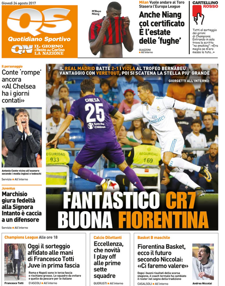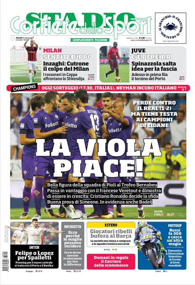 Queste le prime pagine dei quotidiani di Corriere dello Sport, Corriere dello Sport Stadio, Qs-La Nazione, Tuttosport e Gazzetta dello Sport in edicola questa mattina: