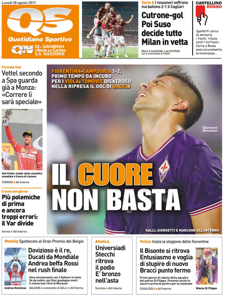 Queste le prime pagine dei quotidiani di Corriere dello Sport, Corriere dello Sport Stadio, Qs-La Nazione, Tuttosport e Gazzetta dello Sport in edicola questa mattina: