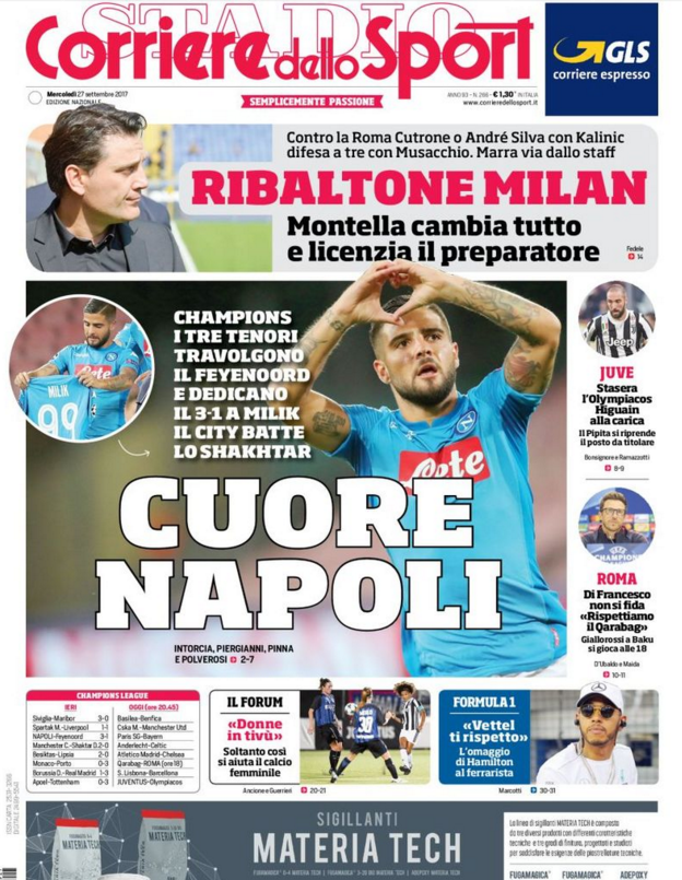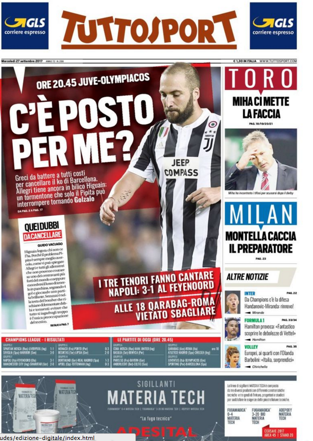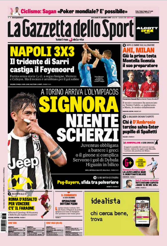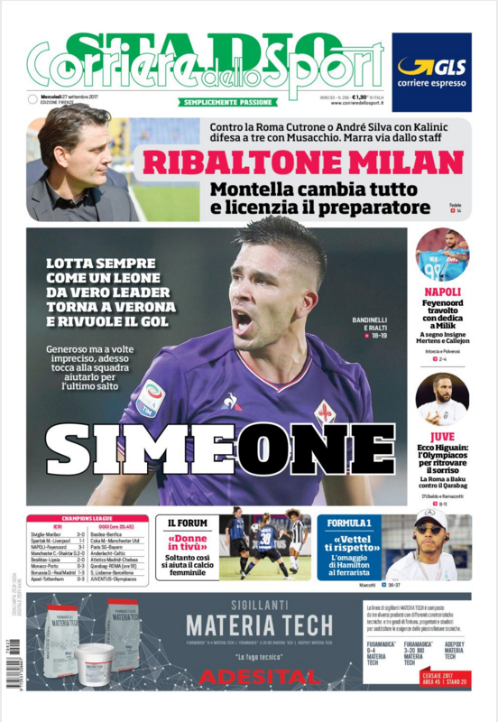 Queste le prime pagine dei quotidiani di Corriere dello Sport, Corriere dello Sport Stadio, Qs-La Nazione, Tuttosport e Gazzetta dello Sport in edicola questa mattina: