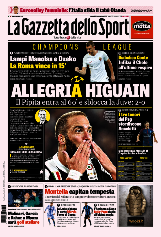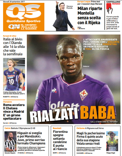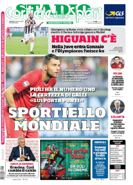 Queste le prime pagine dei quotidiani di Corriere dello Sport, Corriere dello Sport Stadio, Qs-La Nazione, Tuttosport e Gazzetta dello Sport in edicola questa mattina: