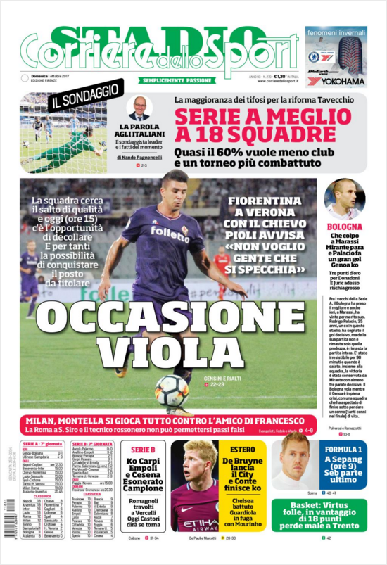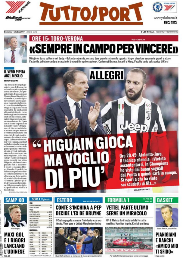 Queste le prime pagine dei quotidiani di Corriere dello Sport, Corriere dello Sport Stadio, Qs-La Nazione, Tuttosport e Gazzetta dello Sport in edicola questa mattina: