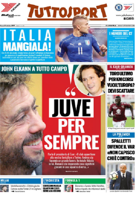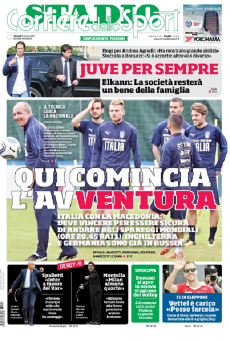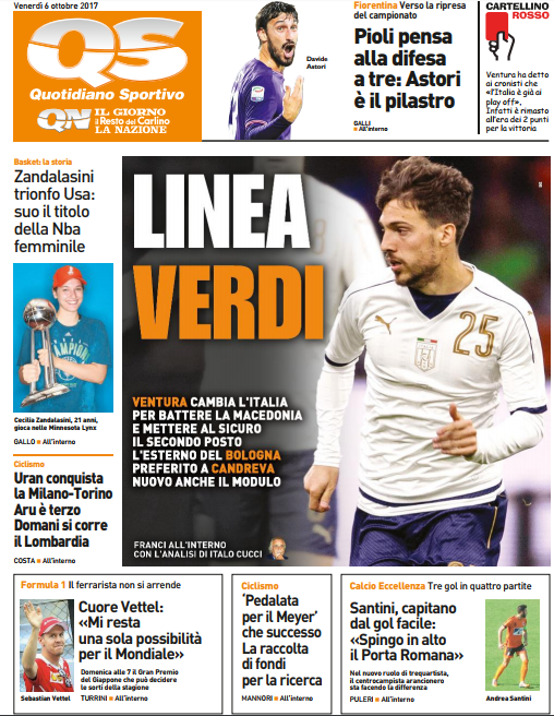 Queste le prime pagine dei quotidiani di Corriere dello Sport, Corriere dello Sport Stadio, Qs-La Nazione, Tuttosport e Gazzetta dello Sport in edicola questa mattina: