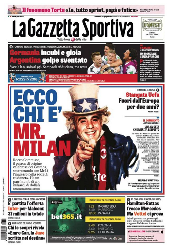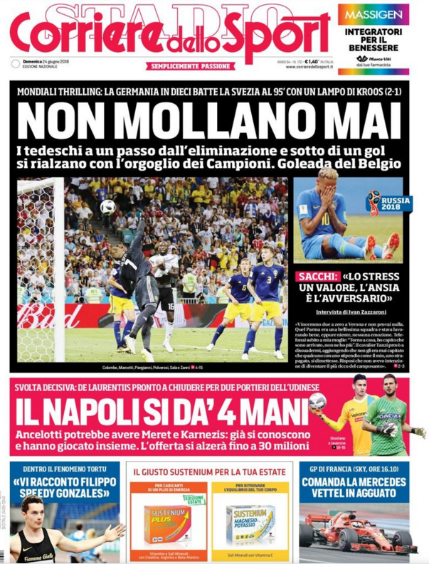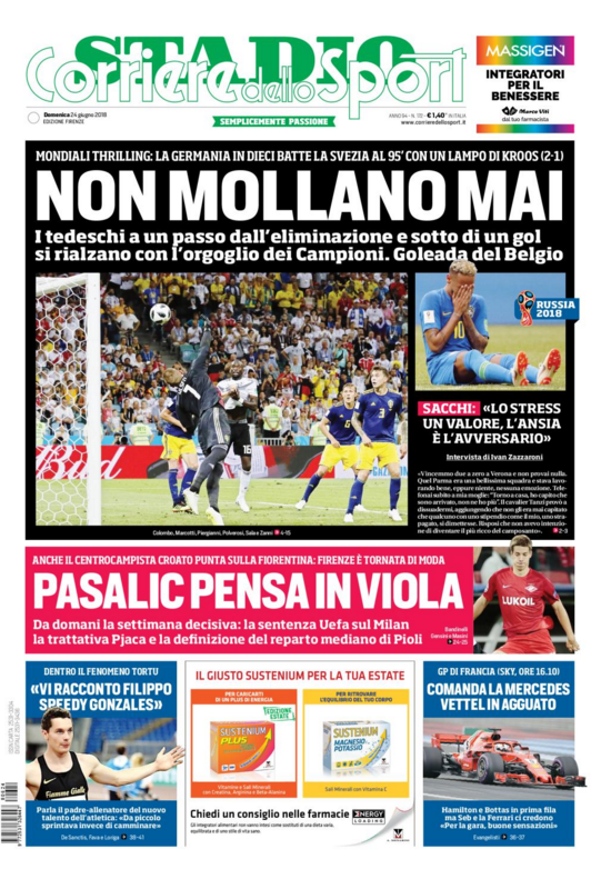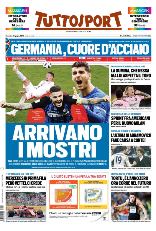 Queste le prime pagine dei quotidiani di Corriere dello Sport, Corriere dello Sport Stadio, Qs-La Nazione, Tuttosport e Gazzetta dello Sport in edicola questa mattina: