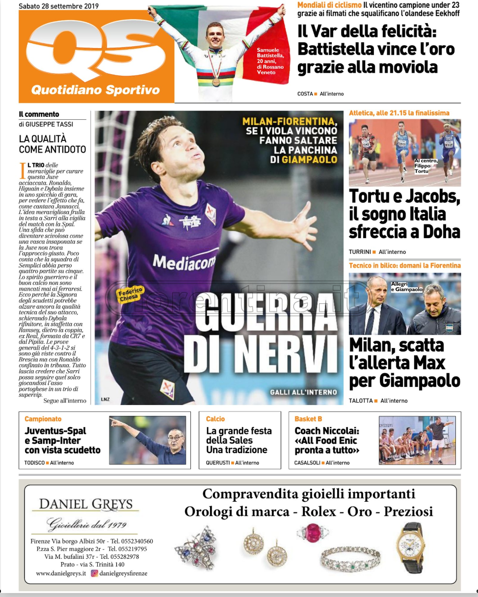 Queste le prime pagine dei quotidiani di Corriere dello Sport, Corriere dello Sport Stadio, Qs-La Nazione, Tuttosport e Gazzetta dello Sport in edicola questa mattina: