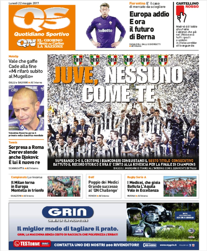 Queste le prime pagine dei quotidiani di Corriere dello Sport, Corriere dello Sport Stadio, Qs, Tuttosport e Gazzetta in edicola questa mattina:
