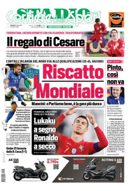 Queste le prime pagine dei quotidiani di Corriere dello Sport, Corriere dello Sport Stadio, Qs-La Nazione, Tuttosport e Gazzetta dello Sport in edicola questa mattina: