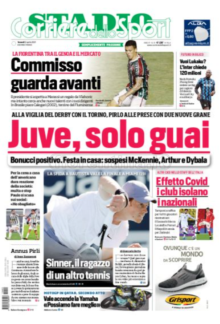Queste le prime pagine dei quotidiani di Corriere dello Sport, Corriere dello Sport Stadio, Qs-La Nazione, Tuttosport e Gazzetta dello Sport in edicola questa mattina: