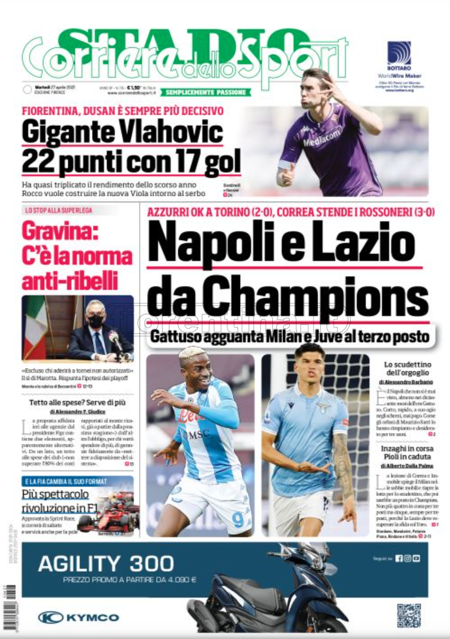 Queste le prime pagine dei quotidiani di Corriere dello Sport, Corriere dello Sport Stadio, Qs-La Nazione, Tuttosport e Gazzetta dello Sport in edicola questa mattina:
