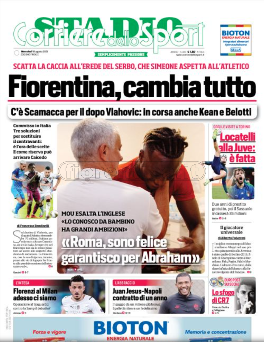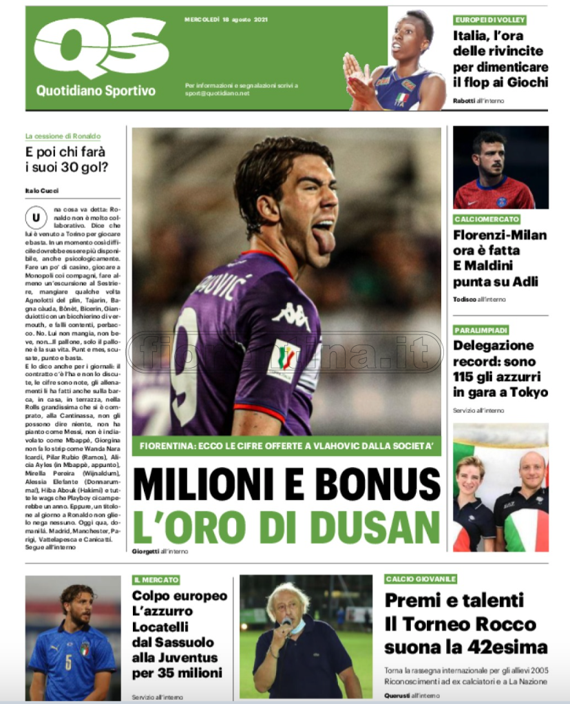 Queste le prime pagine dei quotidiani di Corriere dello Sport, Corriere dello Sport Stadio, Qs-La Nazione, Tuttosport e Gazzetta dello Sport in edicola questa mattina: