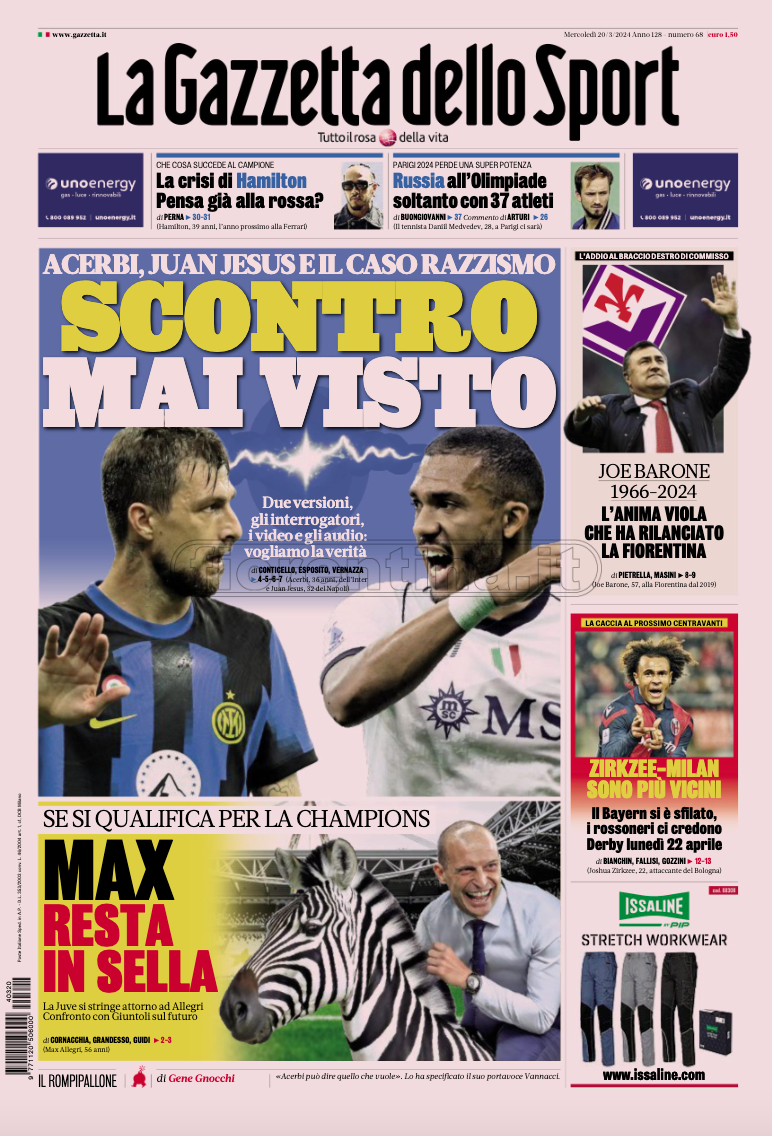Queste le prime pagine dei quotidiani di Corriere dello Sport, Corriere dello Sport Stadio, Qs-La Nazione, Tuttosport e Gazzetta dello Sport in edicola questa mattina: