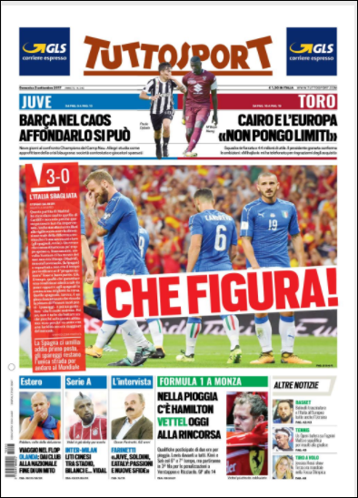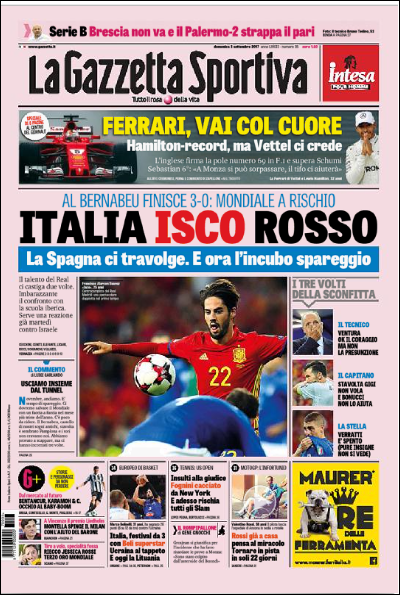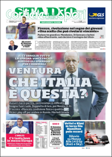 Queste le prime pagine dei quotidiani di Corriere dello Sport, Corriere dello Sport Stadio, Qs-La Nazione, Tuttosport e Gazzetta dello Sport in edicola questa mattina: