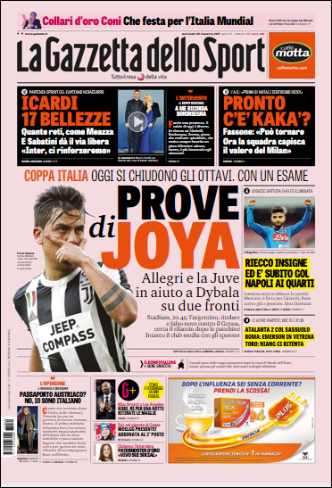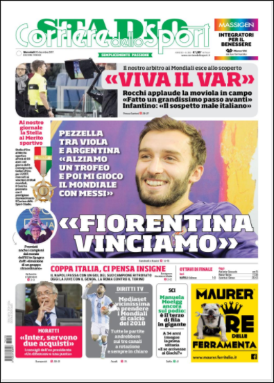 Queste le prime pagine dei quotidiani di Corriere dello Sport, Corriere dello Sport Stadio, Qs-La Nazione, Tuttosport e Gazzetta dello Sport in edicola questa mattina: