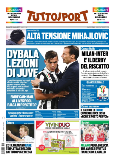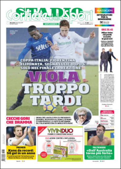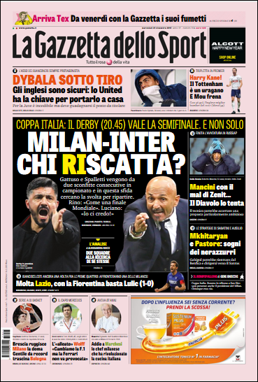 Queste le prime pagine dei quotidiani di Corriere dello Sport, Corriere dello Sport Stadio, Qs-La Nazione, Tuttosport e Gazzetta dello Sport in edicola questa mattina: