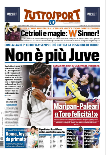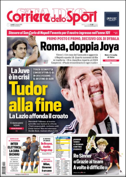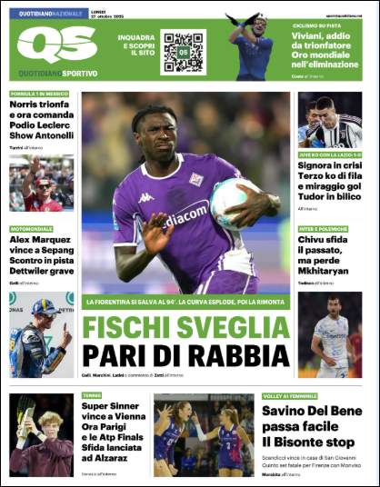 Queste le prime pagine di Qs, CorFio, Gazzetta, CorSport, Stadio e Tuttosport in edicola questa mattina, lunedì 27 ottobre 2025